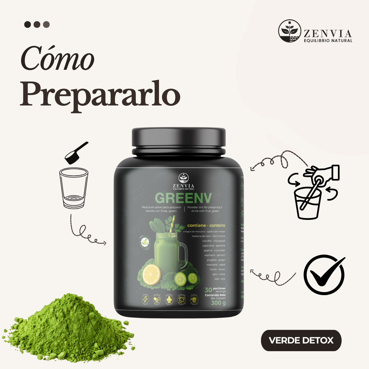 Jugo Verde Détox y Energizante Natural.  GREENV es un jugo verde funcional en polvo elaborado con vegetales, frutas, fibra prebiótica y extractos botánicos seleccionados para acompañar procesos naturales de energía, depuración y equilibrio digestivo. Es una mezcla versátil, pensada para cualquier persona que busque sentirse ligera, vital y renovada. Apto para veganos. GREENV no actúa como un détox extremo, sino como un apoyo diario para mantener el equilibrio digestivo, la ligereza corporal y la sensación de bienestar general.
