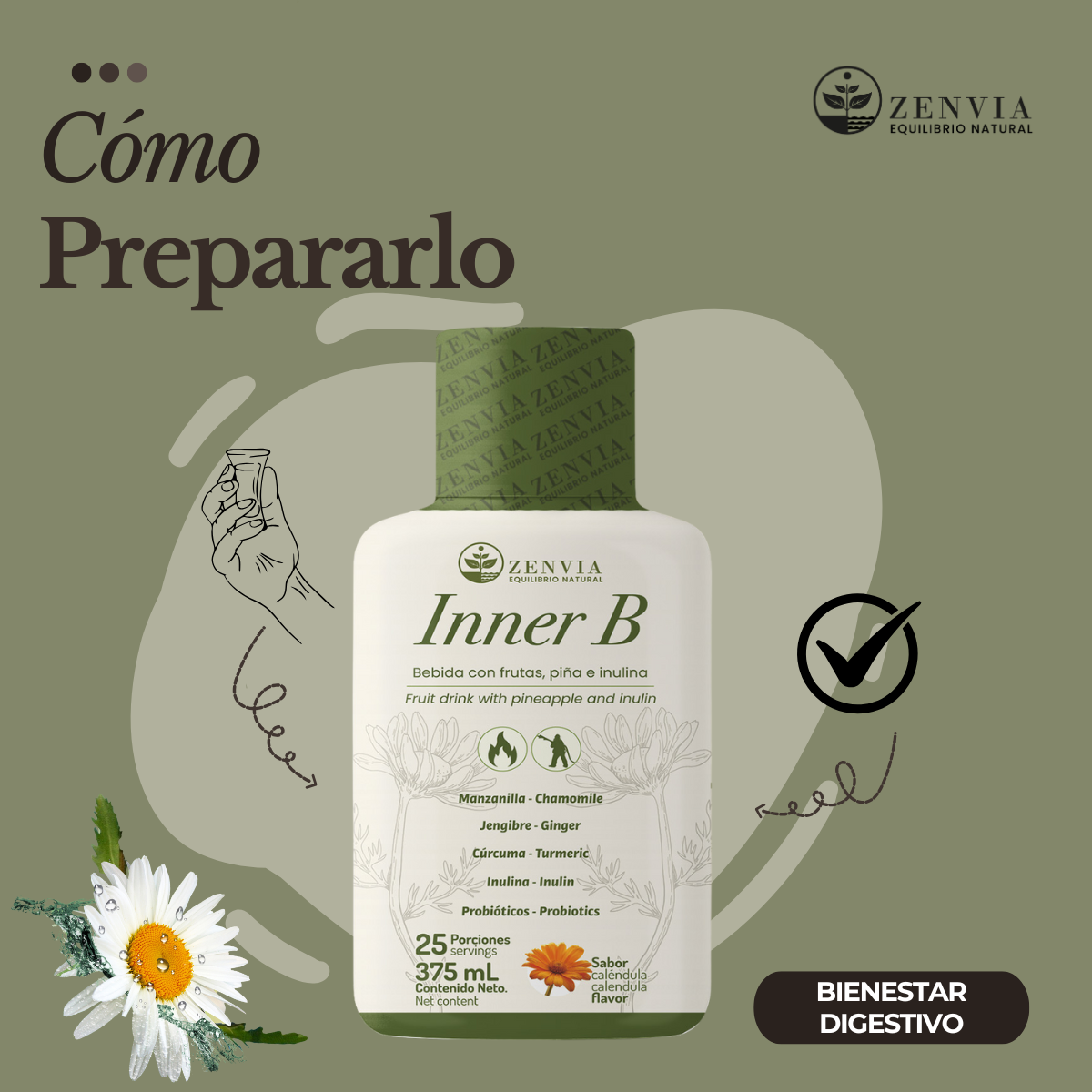INNER B es un suplemento funcional líquido elaborado con extractos vegetales, frutas, prebióticos y probióticos, diseñado para acompañar el bienestar digestivo diario y el equilibrio del microbiota intestinal. Su formato líquido permite una fácil absorción, integrándose a rutinas de autocuidado enfocadas en la digestión, la ligereza abdominal y el confort intestinal.
